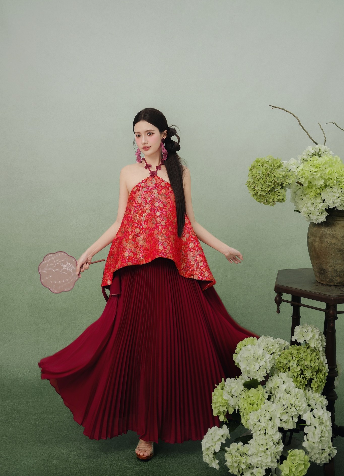 Áo cổ yếm bằng vải gấm với sắc đỏ tươi tắn, phần cổ cách điệu bằng dây quàng qua cổ đính kết những bông hoa nổi tinh xảo. Chiếc áo với những bông hoa nhỏ được sử dụng chất liệu bóng phản quang khiến mỗi khi xuất hiện dưới ánh nắng sẽ thêm phần nổi bật. Chỉ cần thêm một chiếc quạt họa tiết hoa lá là đã dễ dàng tôn lên nét đẹp truyền thống. ẢNH: TIELA CLOTHES
