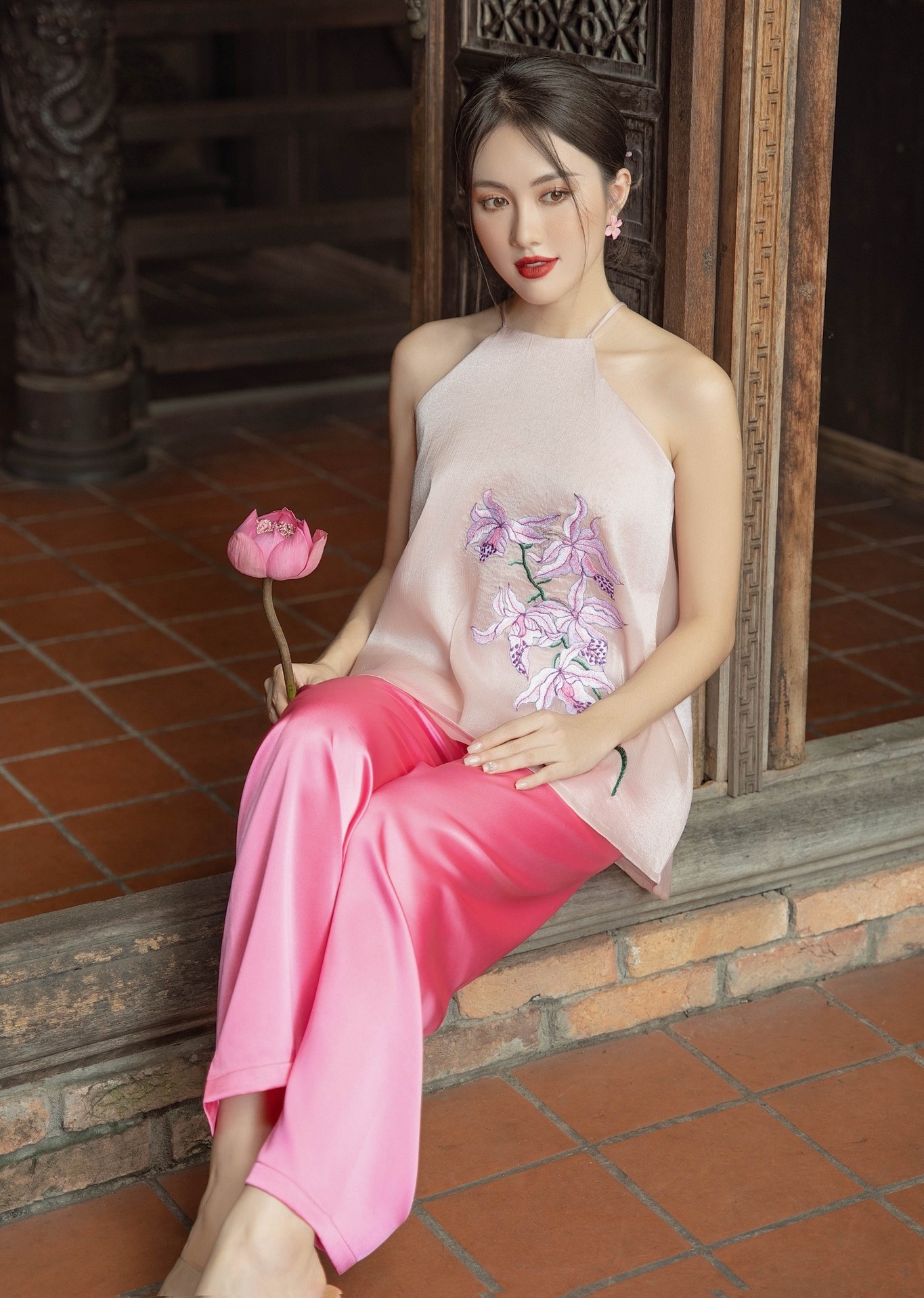 Áo cổ yếm phối quần lụa mang tới cho phái đẹp sự thoải mái đồng thời tôn lên sắc vóc yêu kiều. Chiếc áo cổ yếm sắc hồng nhạt được thêu họa tiết hoa ly sắc tím, phần cổ yếm được cách điệu hai dây tôn trọn bờ vai thanh mảnh. Phối cùng quần suông dài chất liệu lụa bóng màu hồng cánh sen đem lại nét nữ tính cho những buổi dạo phố ngày đầu năm. ẢNH: THE KAT