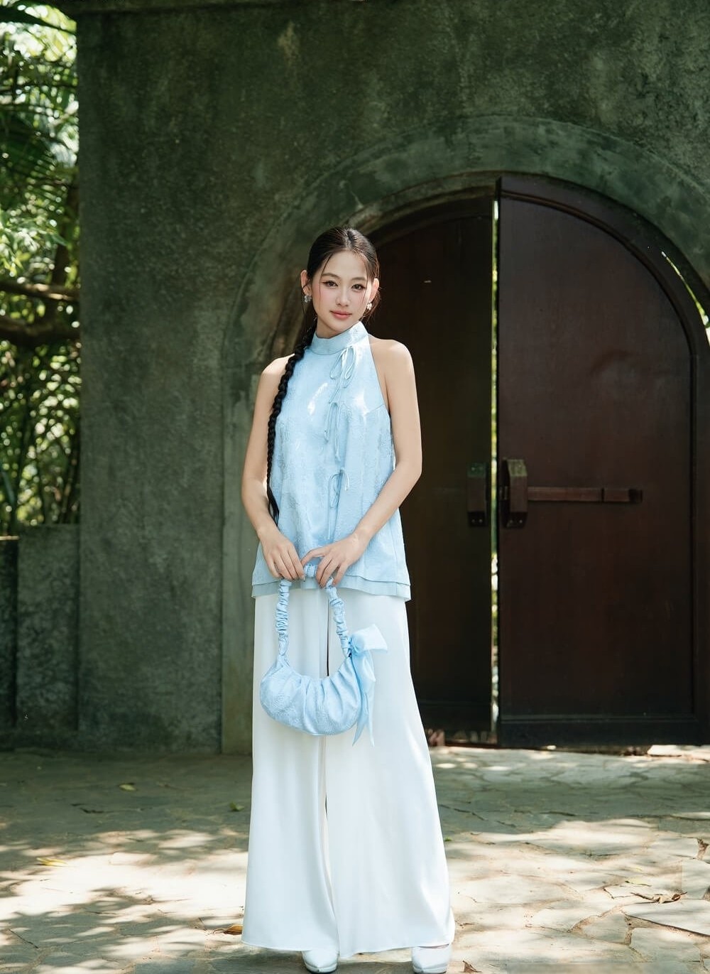 Đem lại sự dịu mát với áo cổ yếm sắc xanh pastel, thiết kế áo hai lớp cùng họa tiết nơ đính kết. Chất liệu voan thoáng mát cùng sự cắt xẻ nhẹ nhàng khiến nàng khoe trọn nét nữ tính ngày xuân. Phối cùng quần lụa sắc trắng tinh khôi, các cô gái đã sở hữu bản phối yêu kiều, vừa mang nét truyền thống vừa giao thoa với nét đẹp hiện đại. ẢNH: RUZA