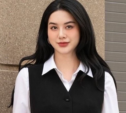 Ghi điểm khi diện áo gile xanh than cổ chữ V cùng hàng cúc bọc vải đồng màu, chiếc sơ mi voan trắng tạo nên sự chuyên nghiệp. Khi kết hợp cùng chân váy midi cùng tông và giày cao gót hở mũi sắc be tạo những điểm chấm phá cho trang phục