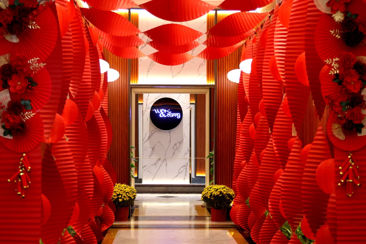 Không gian Tết tại Sheraton Phú Quốc được định hình theo tinh thần hiện đại, nổi bật với sắc đỏ ruby, kết hợp hài hòa các chất liệu lụa, tre và giấy thủ công để tạo nên tổng thể sang trọng mà vẫn gần gũi. Điểm xuyết trong không gian là sắc mai vàng – dấu ấn mùa xuân quen thuộc, gợi mở không khí Tết truyền thống một cách tinh tế.