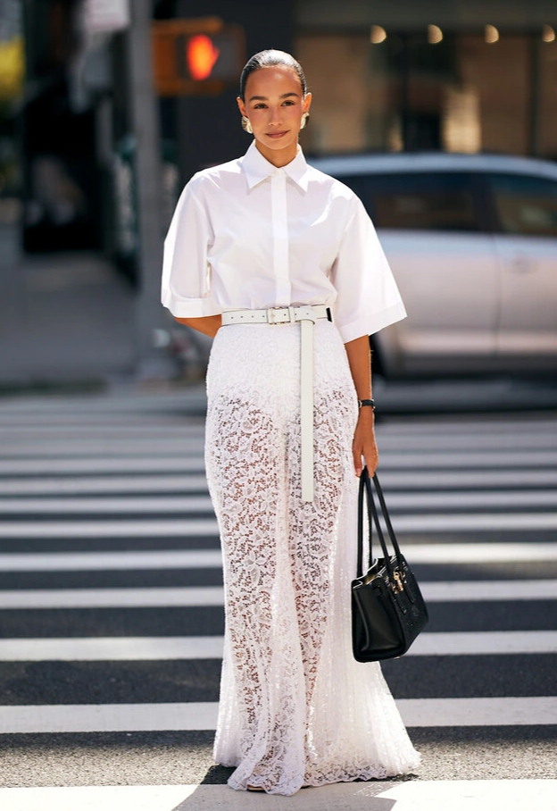 Toàn bộ trang phục màu trắng trong khi chờ đón mùa hè: chiếc áo sơ mi trắng tay ngắn được phối cùng chân váy ren dài có thắt lưng và túi xách da màu đen. ẢNH: @NYSTYLE