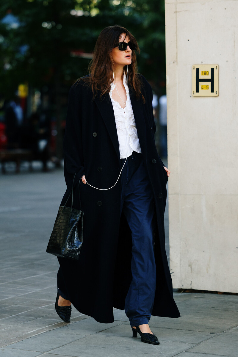 Buổi tối, hãy phối cùng áo khoác dài và quần tây màu xanh dương, giày cao gót mũi nhọn và túi xách da. ẢNH: @LONDONFASHIONWEEK