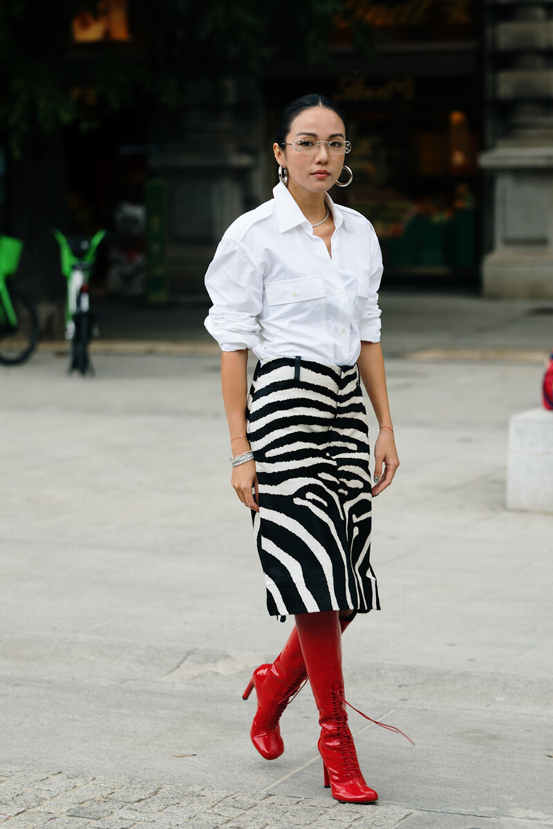 Với chiếc váy họa tiết da báo không hề tối giản và đôi bốt đỏ: vừa lập dị lại vừa sành điệu. ẢNH: @STREETSTYLESPY.DK