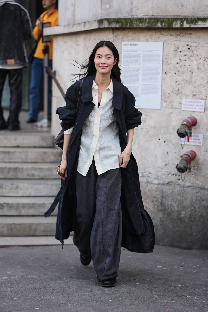 Bộ trang phục trang trọng với áo sơ mi trắng sẽ làm mềm mại dáng người khi kết hợp với quần tây xếp ly, áo khoác dáng dài và áo sơ mi sáng màu. ẢNH: @EDWARD BERTHELOT